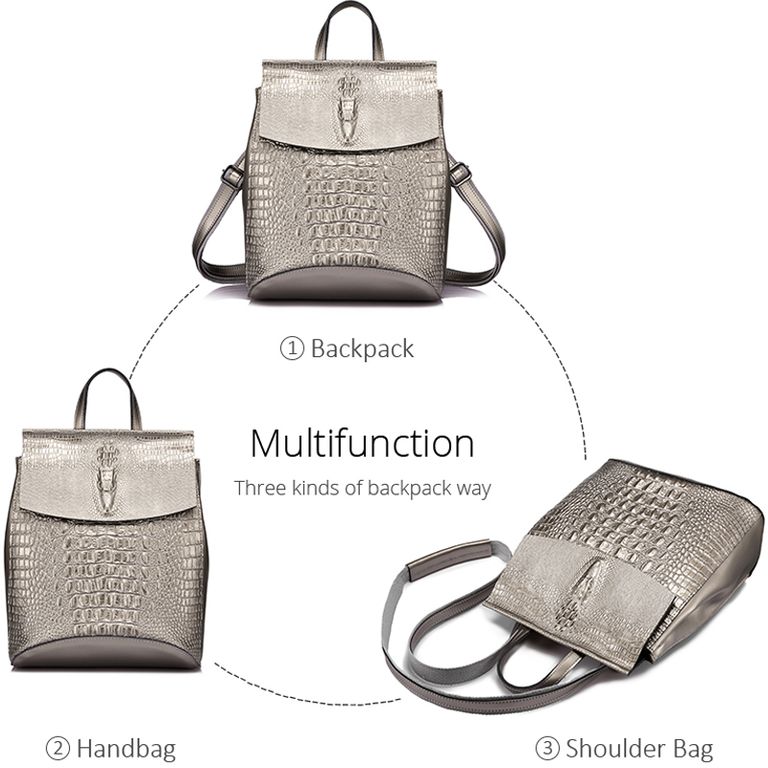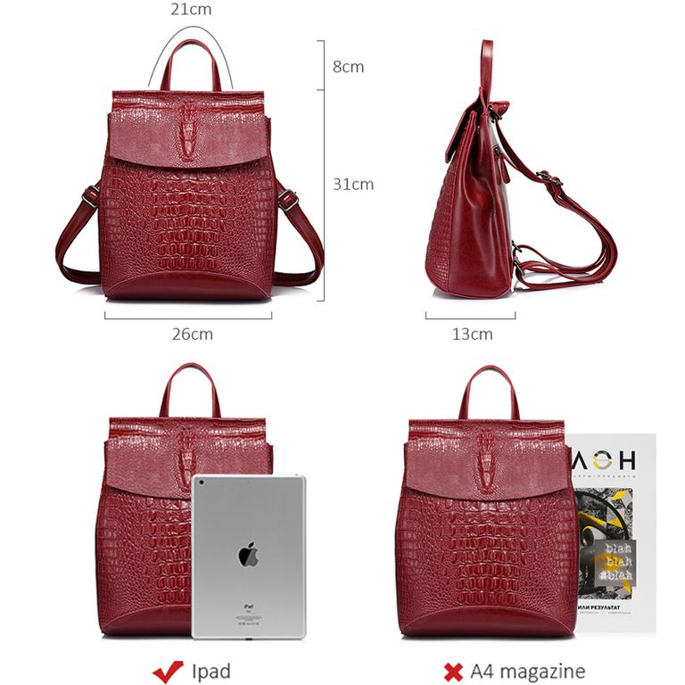 Женский рюкзак из натуральной кожи (сплит-кожа) с принтом под аллигатора. Застегивается на молнию и крышку-клапан на магните. Имеет внутренние карманы, регулируемые плечевые ремни. Может трансформироваться в сумку на плечо. Снаружи на задней поверхности имеет горизонтальный карман на молнии. Размеры: длина - 26 см, ширина- 13 см, высота - 31 см. Производство - Китай.