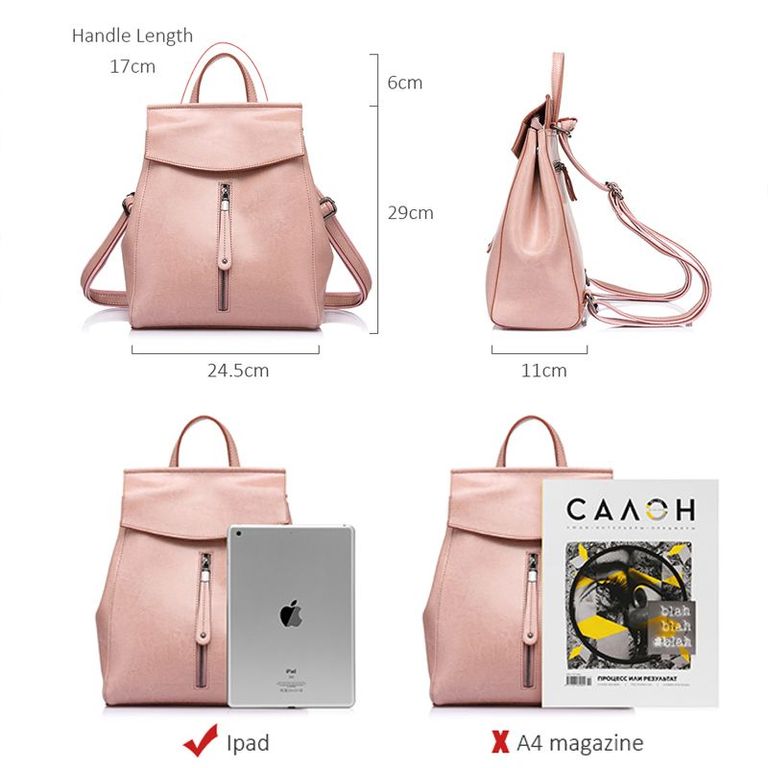 Женский рюкзак из сплит-кожи. Застегивается на молнию и крышку-клапан на магните. Имеет внутренние карманы, регулируемые плечевые ремни. Может трансформироваться в сумку на плечо. Снаружи спереди имеет вертикальный карман на молнии, на задней поверхности имеется горизонтальный карман. Размеры: длина - 24,5 см, ширина- 11 см, высота - 29 см. Производство - Китай.