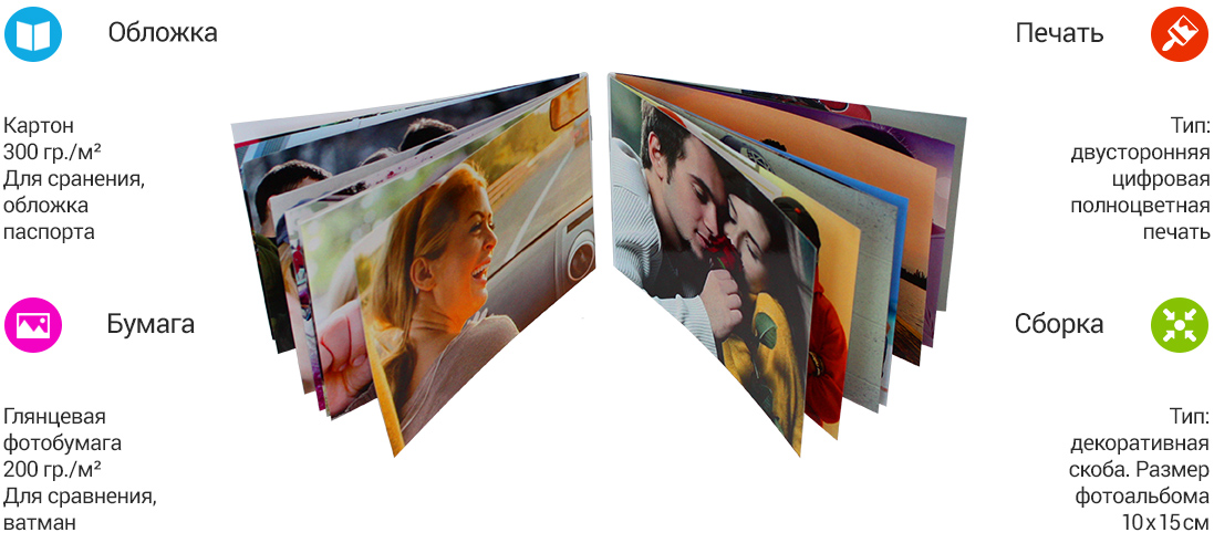 Размер фотоальбома — 10×15 см. Для обложки фотоальбома используется бумага плотностью 300 г/м. Для большей износостойкости обложка ламинируется (для сравнения — обложка паспорта). Для фотографий используется специальная матовая фотобумага плотностью 250 г/м. Плотность бумаги для фотографий должна быть меньше, чем плотность обложки фотоальбома, для того, чтобы при перелистывании бумага и краска не трескались (для сравнения — ватман). Бумага, которая используется для фотоальбома изготовлена в Англии и имеет класс качества А+ 5/5. Переплет — металлическая декоративная скоба. Печать и сборка фотоальбомов происходит в профессиональной типографии в г. Санкт-Петербурге квалифицированными специалистами. По любым вопросам, необходимо обращаться в чат на сайте или по почте info@coverbook.ru |