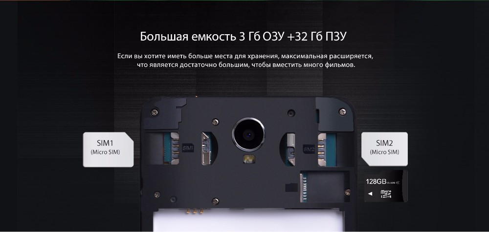 Объем памяти: оперативная — 3 GB, встроенная — 32 GB, слот для карт microSD до 128 GB