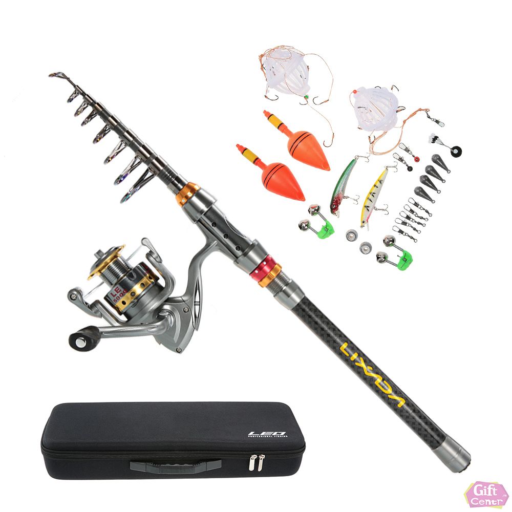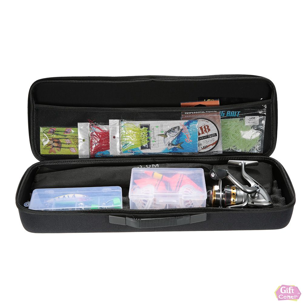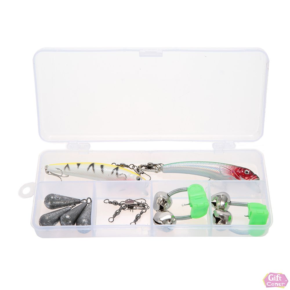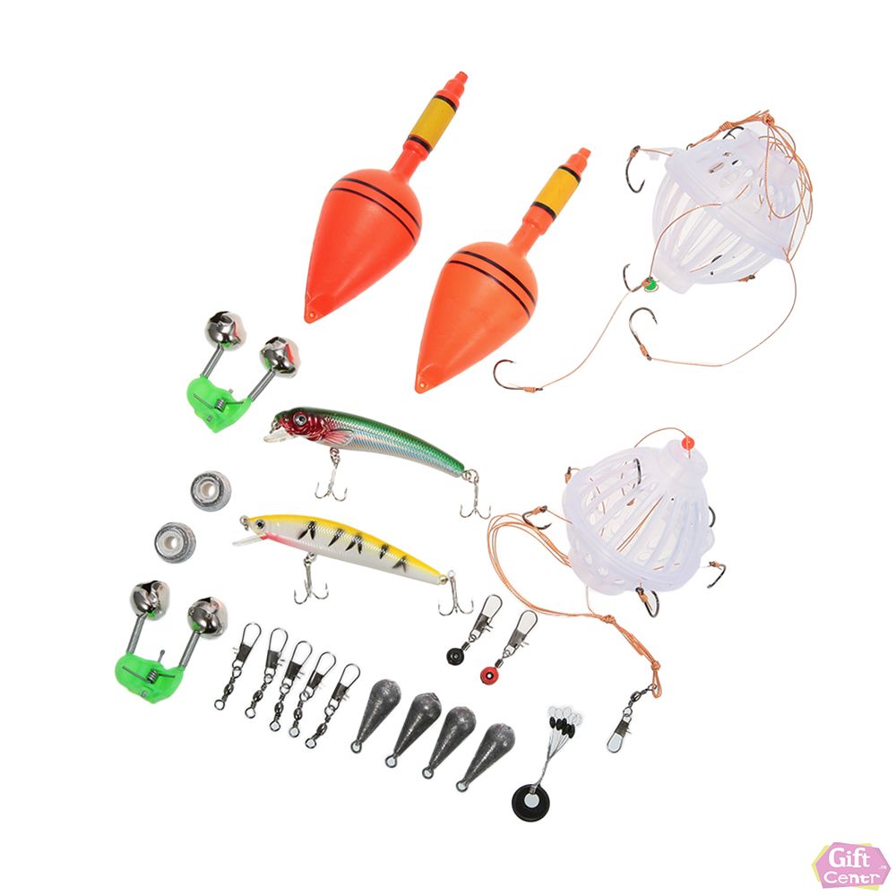 Включает в себя разные виды приманок, набор рыболовных крючков, удочку и другие аксессуары.