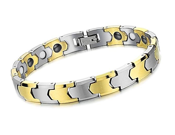 Магнитный браслет из нержавеющей стали с золотым напылением - это эксклюзивное украшение, сочетающее уникальность материала, выразительный рисунок и пользу для здоровья! Позолоченные звенья браслета изготовлены из особой марки нержавеющей стали, практически не подверженной коррозии. Сочетание тщательно полированных звеньев дополняет красоту и выразительность современного рисунка.