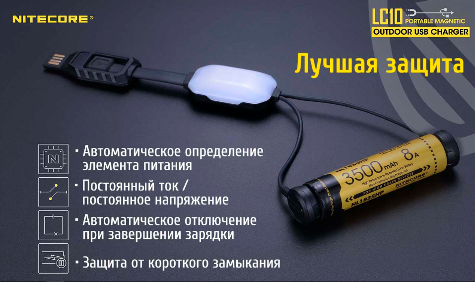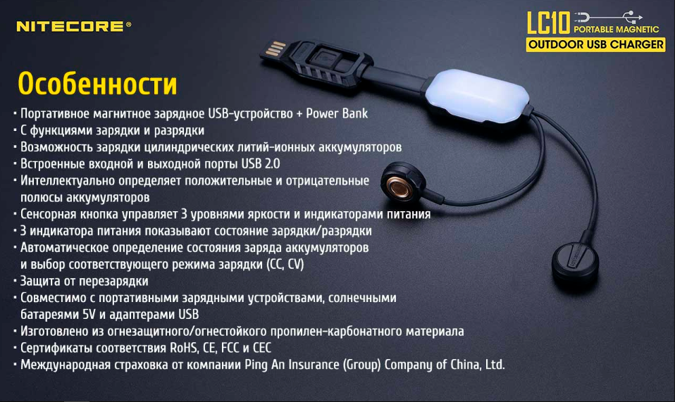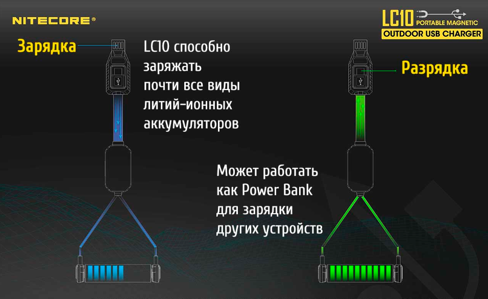 Компанией Nitecore презентовано самое маленькое портативное зарядное устройство, чем-то напоминающее по размерам обычные вакуумные наушники и выступающее в роли Power Bank. Nitecore LC10 – это самое легкое и компактное зарядное устройство, обладающие функциями как зарядки, так и разрядки и эти функции дополнены еще небольшим фонариком. LC10 по многим критериям отличается от традиционных настольных устройств для зарядки, придавая очень много возможностей для использования. Инновационные магнитные части LC10 сделают подсоединение к элементу питания достаточно удобным и главное быстрым, так как предусмотрены на автоматическое определение полюса контакта.