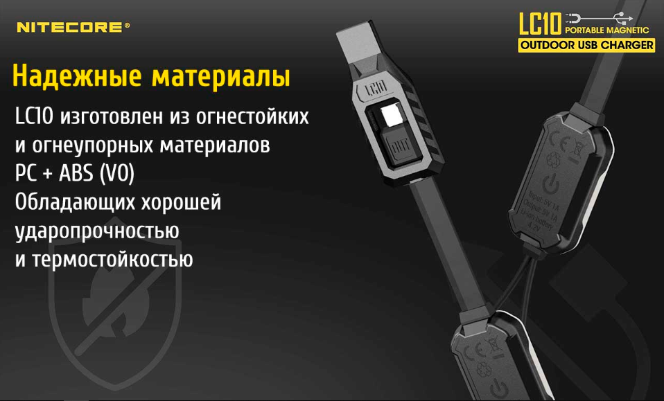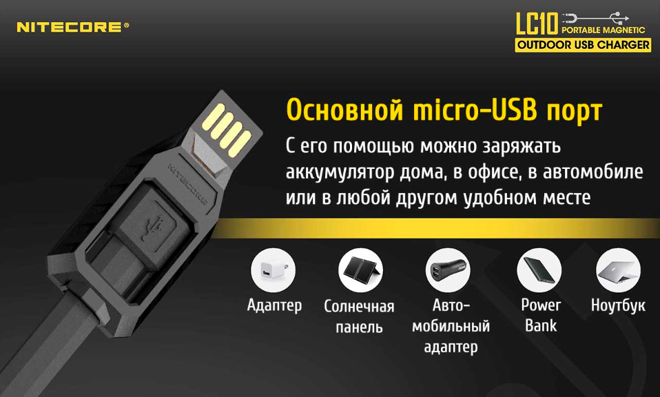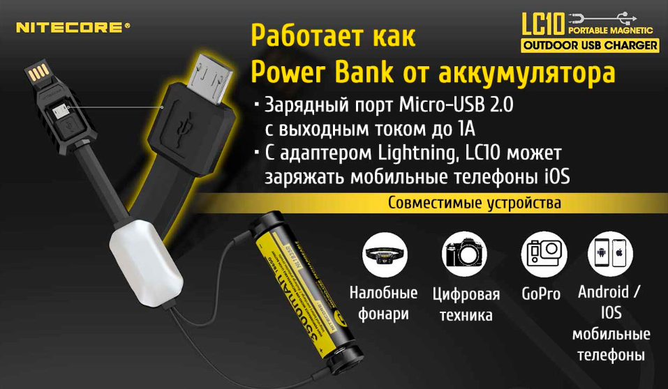 Помимо встроенного порта micro-USB 2.0, LC10 может использоваться для зарядки устройств компании Apple с входящим в комплект переходником Lightning. Порт micro-USB можно использовать только в том случае, когда LC10 не подключено к источнику питания.
