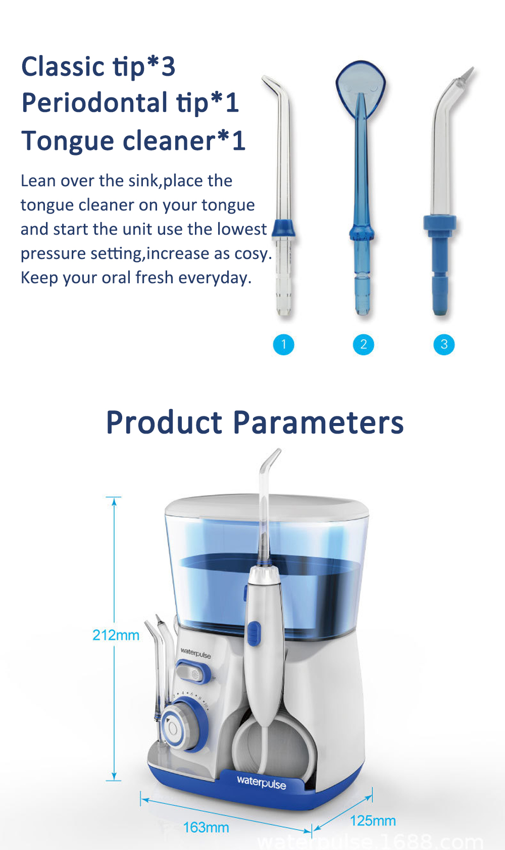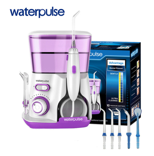 Ирригатор Waterpulse V300- классический представитель семейных ирригаторов с многофункциональностью и значительной вместительностью резервуара в 800 мл., что позволяет проводить ирригацию всей семьей. Насадки, входящие в стандартную комплектацию, позволяют комплексно подойти к процессу ирригации и обеспечить максимально тщательную очистку полости рта.