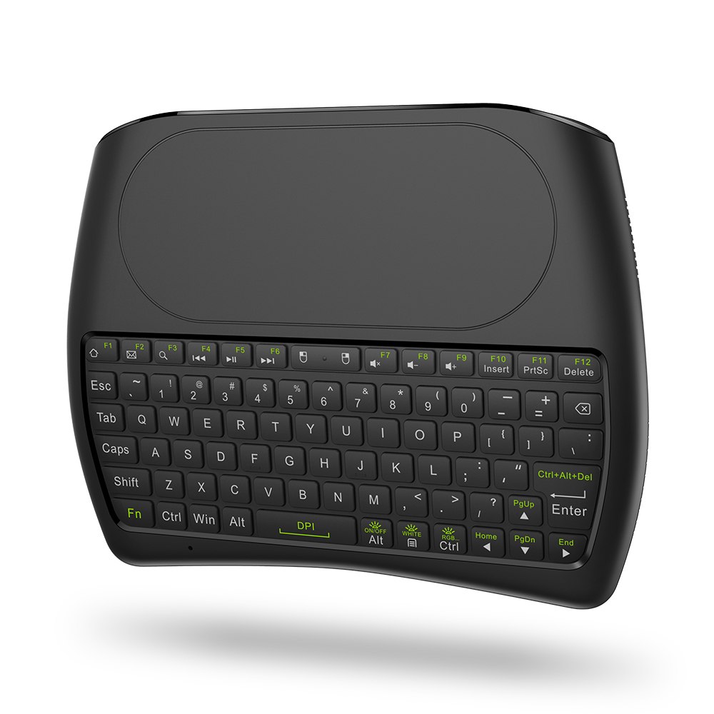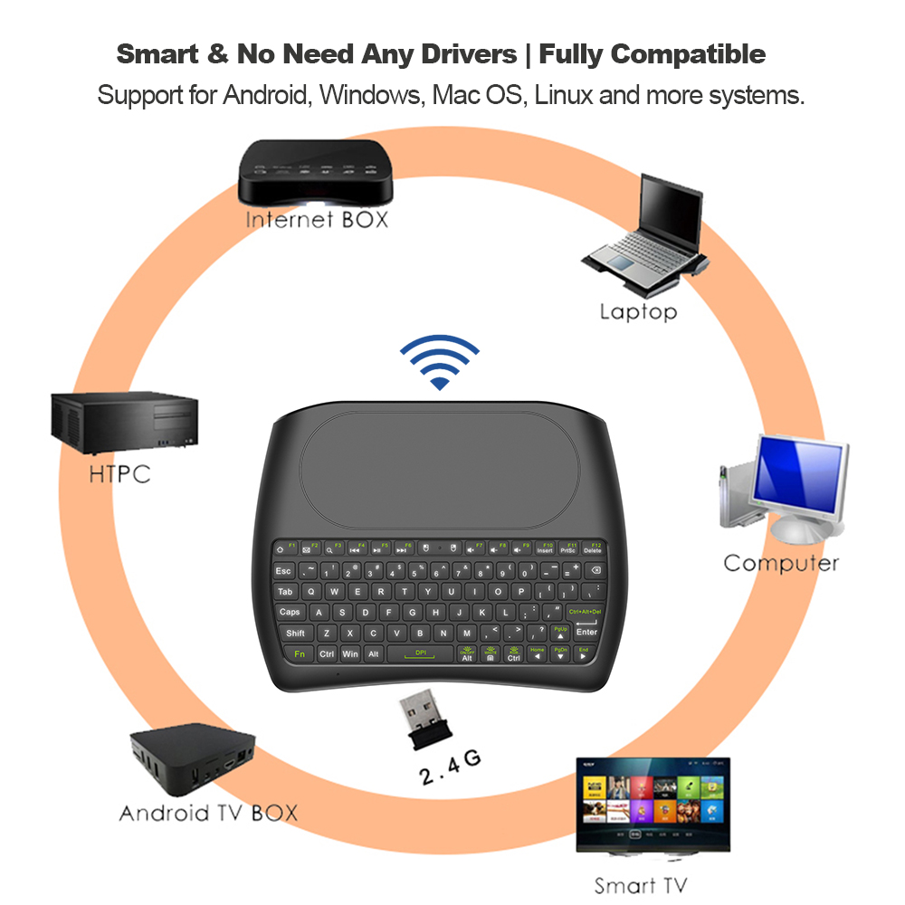 Это 2,4 ГГц Беспроводная мини-клавиатура и тачпад, с USB интерфейсом. Подключаем и Играем, простая и удобная. Мини-клавиатура обеспечивает удобный набор текста, вы можете управлять вашими устройствами сидя на диване.
