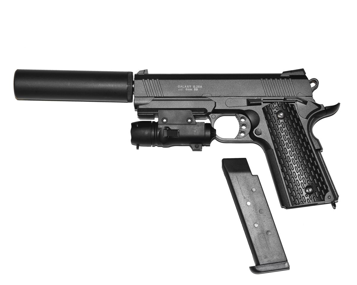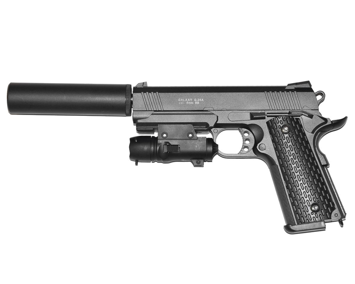 Разработанная на основе более современной модификации пистолета Colt 1911 спринговая модель для страйкбола Galaxy G.25A представляет из себя качественную модель в очень необычной комплектации. В комплекте, помимо самого пистолета находятся ЛЦУ прицел и фальш - глушитель. Все эти опции съемные и использовать их или же оставить пистолет в первозданном виде остается на усмотрении владельца.
