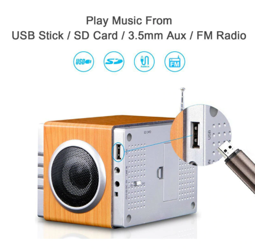 Благодаря встроенному аккумуляторуданный многофункциональный радиобудильник можно использовать какпортативный динамикПодключите к нему свой телефон, SD-картуфлешку или MP3 плеер и наслаждайтесь музыкой сглубоким басом где угодно и когда угодно.