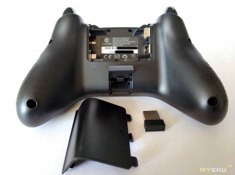 На нижней стороне находится крышка отсека элементов питания и ниже её — отсек, в котором находится 2,4 ГГц беспроводной адаптер.