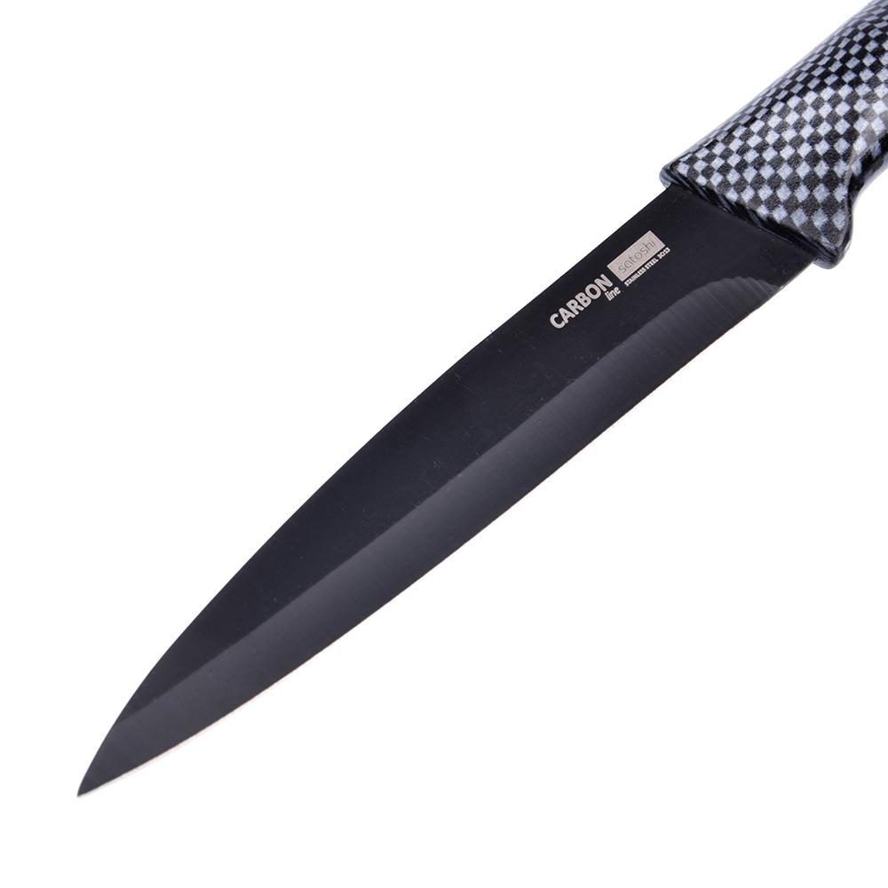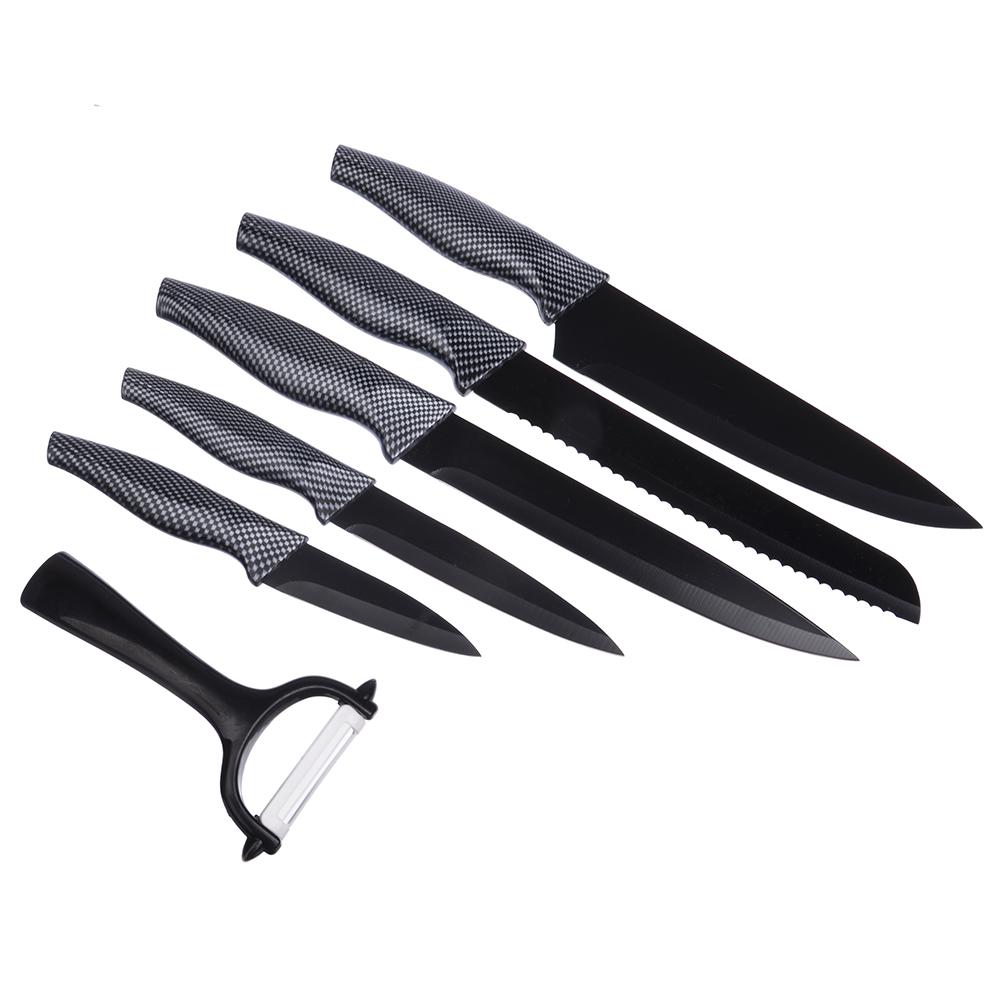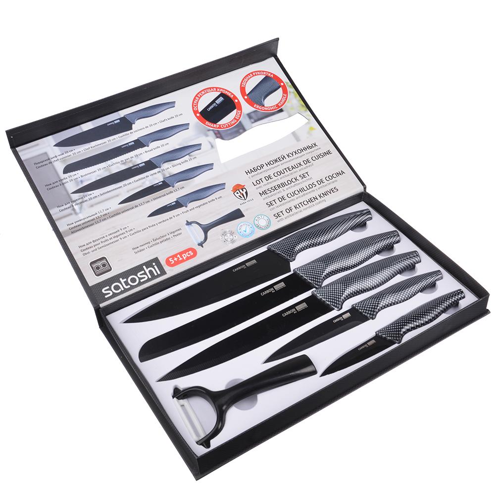 Кухонный набор из 6 ножей с лезвиями из нержавеющей стали — универсальный помощник на кухне. Стальные аксессуары не боятся твердых продуктов и большого давления. Они выдерживают механические повреждения, удары, соседство с другими металлическими приборами и автоматическую мойку. Кухонный нож из нержавеющей стали не испугаешь температурным шоком и кислыми фруктами. Материал не окисляется и не влияет на вкус продуктов.