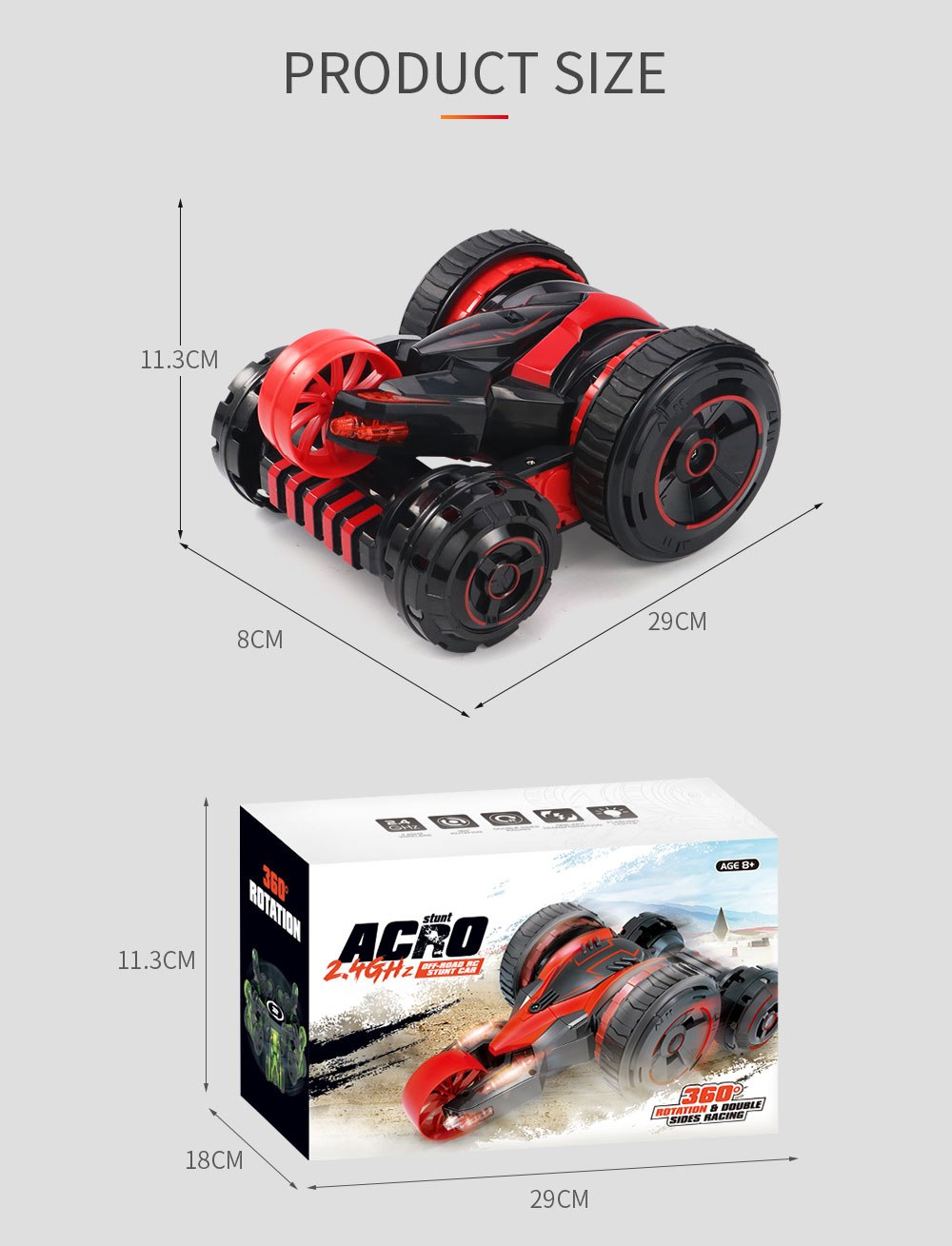 Впечатляющее внешнее исполнение машинки. Ее размеры – 20х15х10 см, при этом максимальная высота может быть 20см, а длина – 29см. Данный агрегат 5-ти колесный: 2 основных и 3 вспомогательных для совершения маневров. Два ведущих колеса прорезинены.