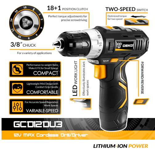 Аккумуляторная дрель DEKO GCD12DU3 12 V MAX 3/8 дюйма обладает профессиональной мощностью при невероятно легком весе (около 3 фунтов). Его максимальная емкость сверления 35 мм для дерева, номинальный крутящий момент 32 Н. М. Это соотношение производительности и веса делает сверло хорошим подходом для небольшой и сложных условий. Это отличное решение для электриков, сантехников или контрагентов, которые делают много бурения над головой. Беспроводная Дрель DEKO GCD12DU3-это прекрасная основа для любого профессионального поставщика или набора электроинструментов DIYer.