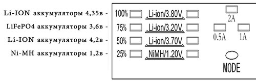 Установите аккумуляторы, соблюдая полярность (в устройстве присутствует защита от неправильной установки батарей). В течение 5 сек. устройство определит тип аккумулятора (Ni-MH или Li-ion) и начнет заряд. Прогресс заряда аккумуляторов отображается в виде 4 мигающих индикаторов. Каждый индикатор обозначает примерно 25% заряда аккумулятора. При полном заряде аккумулятора все индикаторы горят не мигая. При установке Li-ion 4,35в и LiFePO4 аккумуляторов необходимо выбрать конечное напряжение заряда. (По умолчанию всегда включается заряд до 4,2в). Для этого в течение 5 сек после установки аккумулятора нажмите кнопку управления MODE. С помощью индикатора выберите необходимое конечное напряжение заряда. Надписи на индикаторах соответствуют: