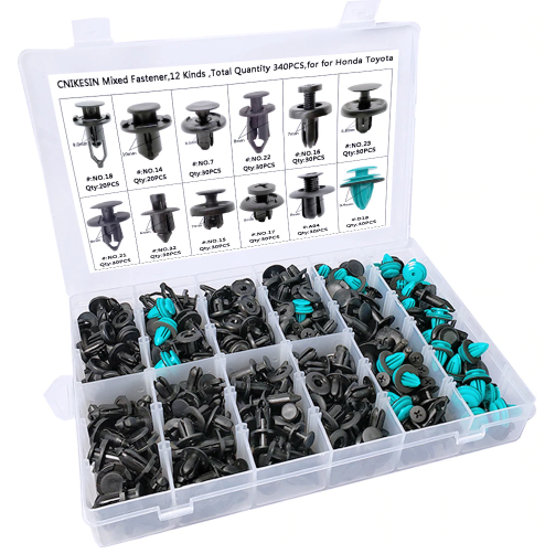 В коробке 340 шт. разного размера и конструкции, которые подойдут для крепежа бампера, дверной обивки, крыла авто и т.д. для автомобилей.