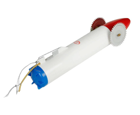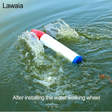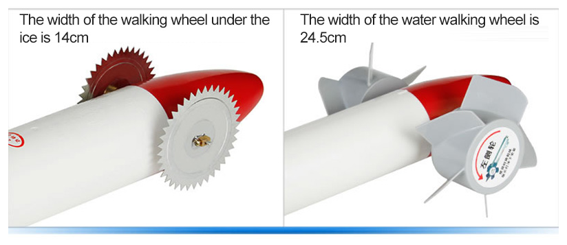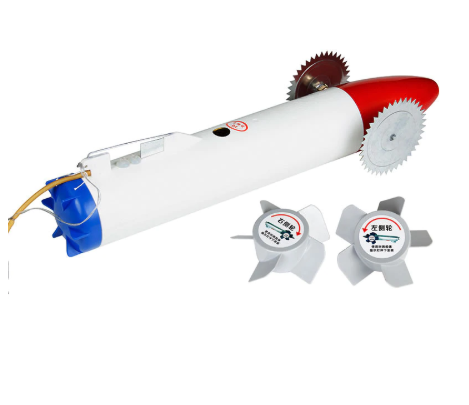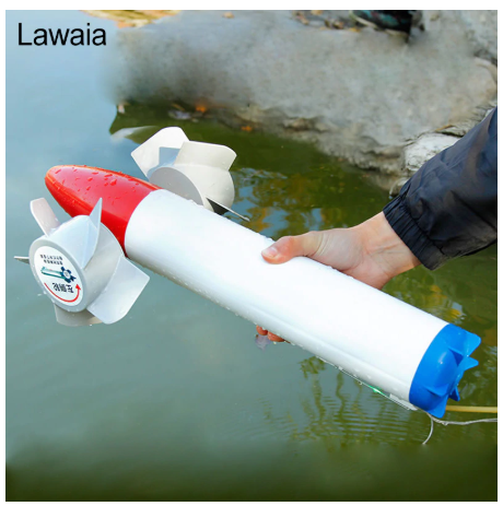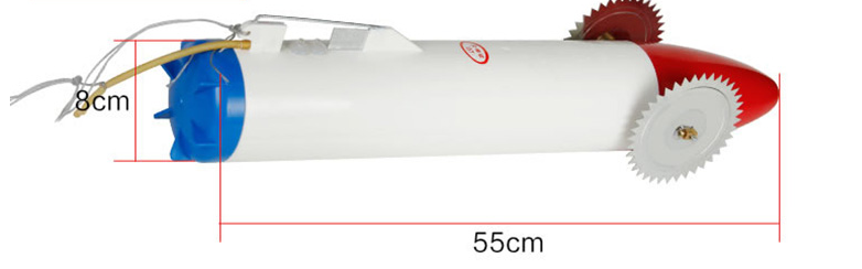 Очень интересное приспособление для растягивания сетей. Вся суть заключается в том, что на одном конце расположены лопасти с моторчиком, а к другом привязана сетка и веревка, когда данную ракету включают и опускают на воду, она плывет в нужном направлении и когда сеть растягивается, при помощи специального механизма сеть отцепляется, а сама "ракета" вытягивается за веревку. Самое интересное, что без лопастей данная "ракета" может растягивать сети под льдом.