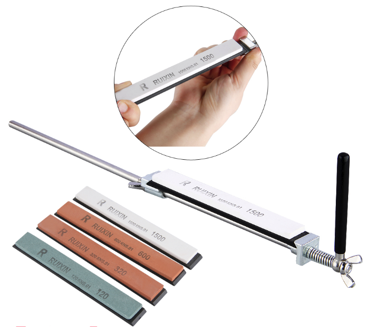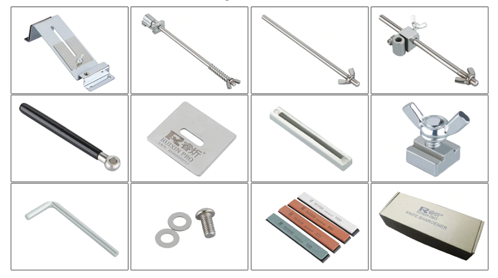Комплектация: станина с 2мя прикрученными пластинами, 3 камня, вертикальная направляющая, разборная (из 2х элементов) горизонтальная направляющая, рукоятка, распорка, болт с 2 шайбами и шестигранный ключ на 4мм. 3 камня: 120, 600, 1500 grit.