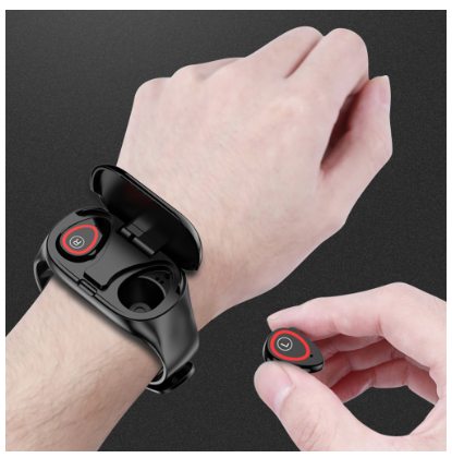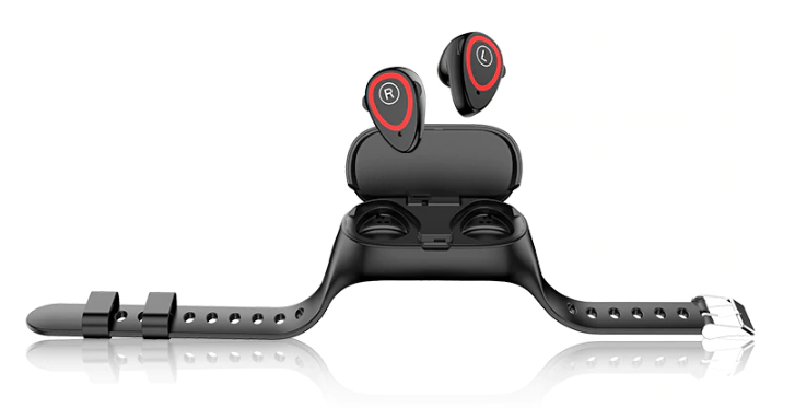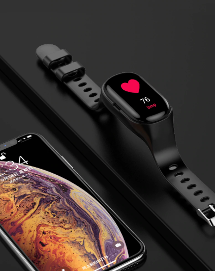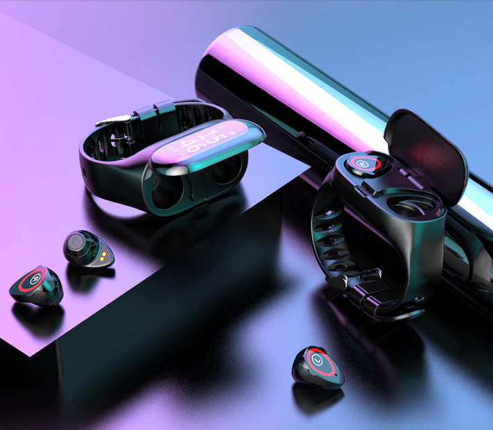 Внешне новинка похожа на рядовой фитнес-трекер с дисплеем. Отличается она лишь толстым корпусом. Причина тому – возможность хранения зарядки беспроводных наушников непосредственно внутри браслета.