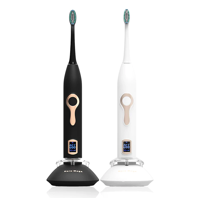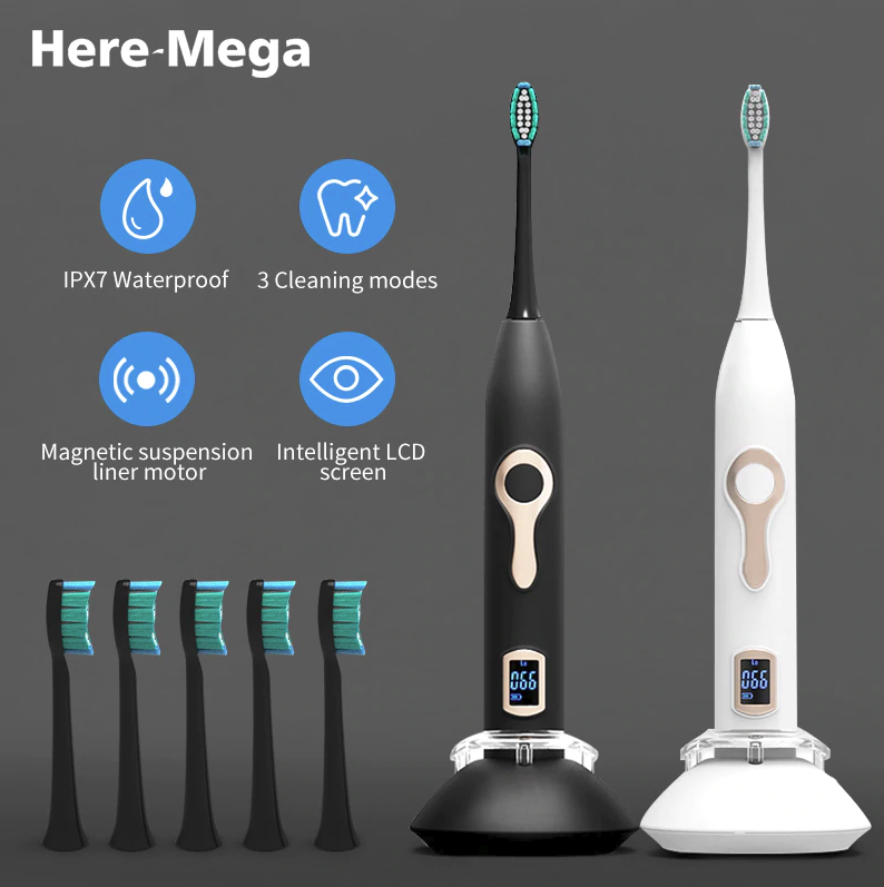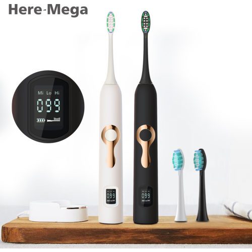Здесь есть 3 режима очищения и жидкокристаллический дисплей для удобного управления. На экране отображается уровень заряда батареи, напоминание о замене головки и другая полезная информация. Продавец предоставляет на выбор зубные щетки с черным или белым корпусом. Можно приобрести комплект с 3 насадками. Благодаря стильному дизайну корпуса и ЖК-экрану эта модель выглядит намного дороже своей цены. Если верить отзывам, недостаток у HERE MEGA 608 только один – громкое жужжание во время работы.