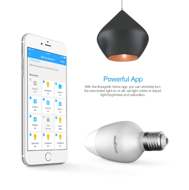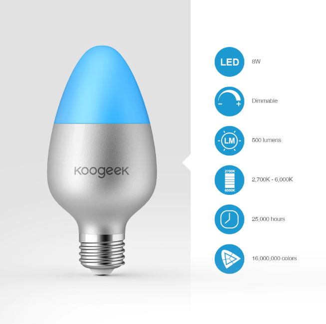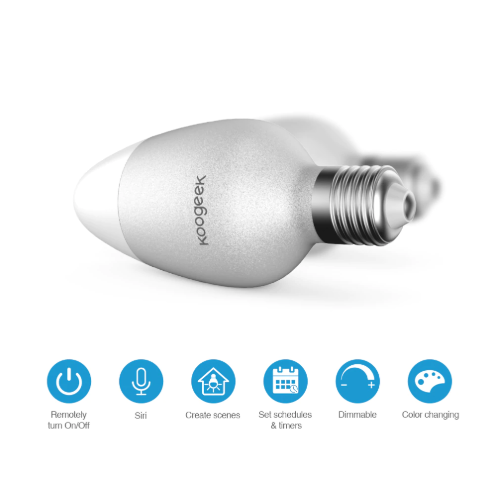 Светодиодный светильник Wi-Fi enab, который использует всего 8 Вт и обеспечивает до 500 люменов света с цветовой температурой от 2700 K до 6000 K. Приложение Koogeek Home предлагает 16 миллионов цветов на выбор. После завинчивания смарт-лампы Настройте ее из приложения Koogeek Home и подключите к сети Wi-Fi 2,4 ГГц. Вы можете удаленно включить или выключить подключенные лампочки, изменить цвета, яркость и насыщенность, установить графики и таймеры, контролировать рабочее состояние и создавать пользовательские сцены из приложения. Он работает с Apple HomeKit, так что вы можете легко управлять подключенными лампами с помощью Siri на вашем iPhone, iPad, iPod touch или Apple Watch.