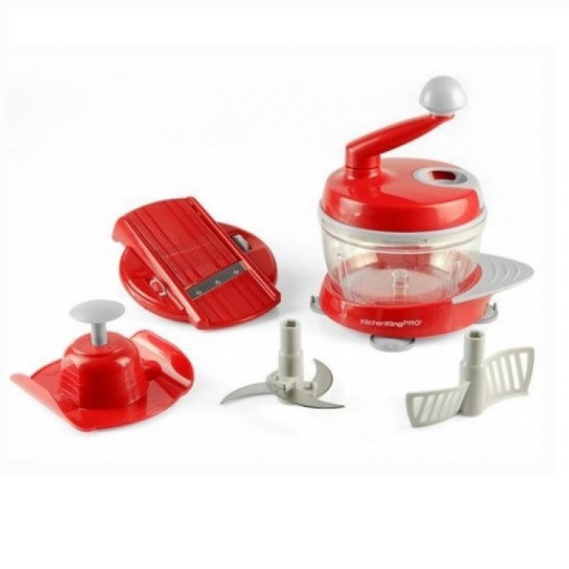 Кухонный комбайн Kitchen King Pro Китчен Кинг Про — это и овощерезка, и тертка, и измельчитель, и ручной кухонный комбайн, и блендер, идаже миксер!!! Все в одном ручном кухонном комбайне Kitchen King Pro Китчен Кинг Про. Он работает без электроэнергии, поэтому безопасен и прост в использовании. Овощерезка Китчен Кинг Про имеет новые свойства и дизайн. В отличии от сохи предшественников,комбайн-тертка Kitchen King Pro Китчен Кинг Про оснащен специальными анти скользящими ножками. Всего за 5-10 секунд и любой Ваш любимый салатик готов к подаче на стол, нужно только заправить его майонезом или оливковым маслом. Окрошка, оливье, винегрет, крабовый или московский салаты с кухонным комбайном Kitchen King Pro Китчен Кинг Про готовить проще простого. Измельчитель Kitchen King Pro Китчен Кинг можно загружать сразу все продукты, а не нарезать отдельно. Вам хочется сесть чего-то особенного! Положите в чашку Kitchen King Pro любимые фрукты — 5 секунд и экзотический фруктовый салатик готов. Надоело плакать при измельчение лука?! Это не проблема!!! При измельчение лука, Вы даже не почувствуете его запаха, разве что только после открытия контейнера. Паштет, майонез, томатная паста, аджика, омлет, картофельные и кабачковые драники, супы, борщи, соусы, кремы к тортам и бисквиты, оладьи, начинки к пирожкам и блинчикам с капусты, фасоли, яблок, овощей, молочные коктейли — все, все, все это Вы можете приготовить с измельчитель для продуктов Kitchen King Pro без еще каких либо приспособлений в считанные секунды. Хотите крупно или мелко нарезанные салаты?! Это тоже не проблема — нужно только считать обороты ручки, чем больше оборотов — тем мельче нарезаны продукты, чем меньше оборотов — тем крупнее нарезаны кусочки. У вас в доме маленький ребенок?! Не нужно покупать блендер…. овощи, фрукты, мясо, супы все с легкостью взбивается в пюре, нужно только сделать немного больше оборотов кучкой чем обычно, пока не получится необходимая для Вас консистенция. Преимущества ручного кухонного комбайна Kitchen King Pro Китчен Кинг Про: стильный дизайн; легок и прост в использовании; не занимает много места; измельчит любой салат; не нуждается в электропитании; нарезает пластинками и соломкой; взбивает коктейли, майонез, бисквитное тесто, тесто на блинчики или оладьи, картофельные драники; легко измельчит пюре для малыша из любых продуктов; овощерезка, терка, измельчитель, кухонный комбайн и блендер — все в одном приборе Kitchen King Pro не нужно заполнять контейнер полностью, он может измельчить всего 2-3 чеснока; легко моется, можно мыть в посудомойке. Комплектация овощерезки Kitchen King Pro Китчен Кинг Про: Kitchen King Pro Китчен Кинг Про Нож для измельчения. Нож для взбивания (омлет, кремы и т. д. ). Терка для нарезания соломкой и пластинками. Размер упаковки: 26*22*19 см.