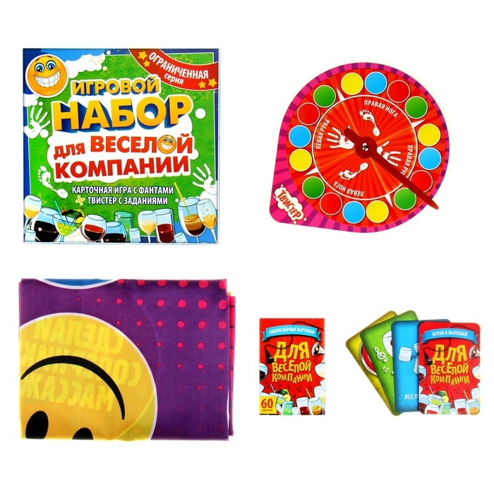 В наборе собрано сразу два хита: игра «Твистер», в которой вам предстоит не только завязываться в узлы, а еще и выполнять различные задания, стоя в неудобных позах, и игра «Для весёлой компании», где нужно будет собирать парные картинки и выполнять сумасшедшие алкогольные фанты.