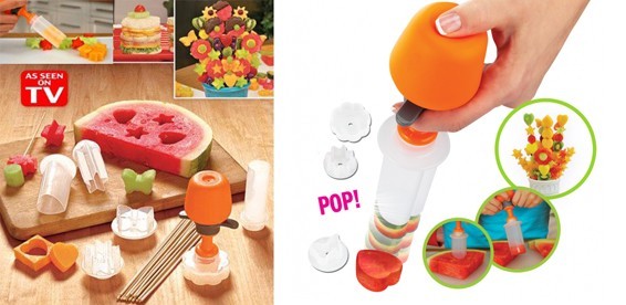 Создавать такие блюда вам поможет набор для канапе и карвинга Pop Chef (Поп Шеф) – набор для украшения стола. При помощи входящих в него приспособлений можно приготовить настоящие шедевры кулинарного искусства. Из овощей и фруктов вы сможете вырезать необычные цветы, фантастические фигурки, приготовить оригинальные маленькие сэндвичи, которые украсят любое блюдо. И все это – без ножей, без опасения порезаться, быстро и просто. С этим справятся даже маленькие дети!